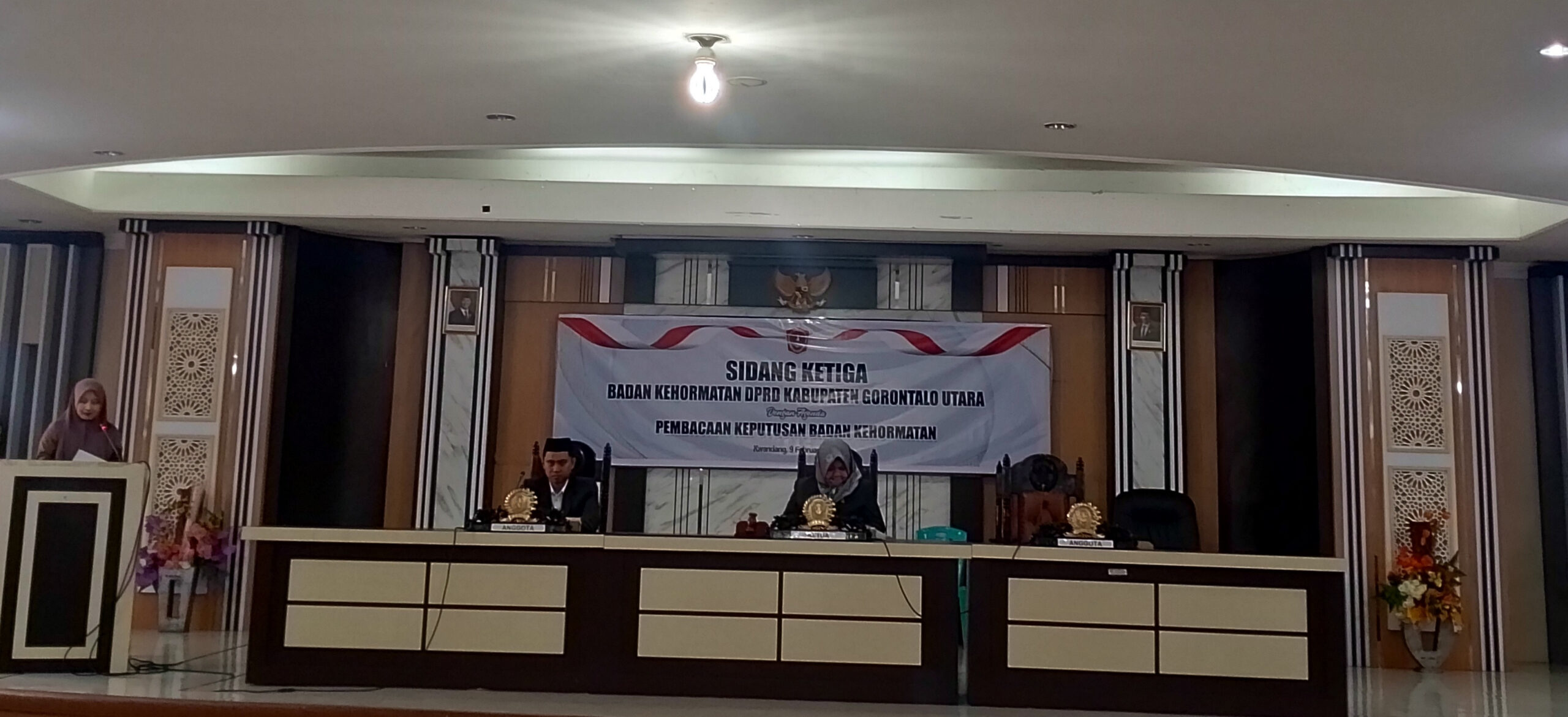 Ia menyampaikan, berdasarkan kesimpulan Badan Kehormatan, terlapor dinyatakan terbukti melakukan pelanggaran kode etik sebagai anggota DPRD Gorontalo Utara. Putusan tersebut, kata Jikran, menyebutkan adanya pelanggaran terhadap kode etik maupun sumpah janji anggota DPRD.