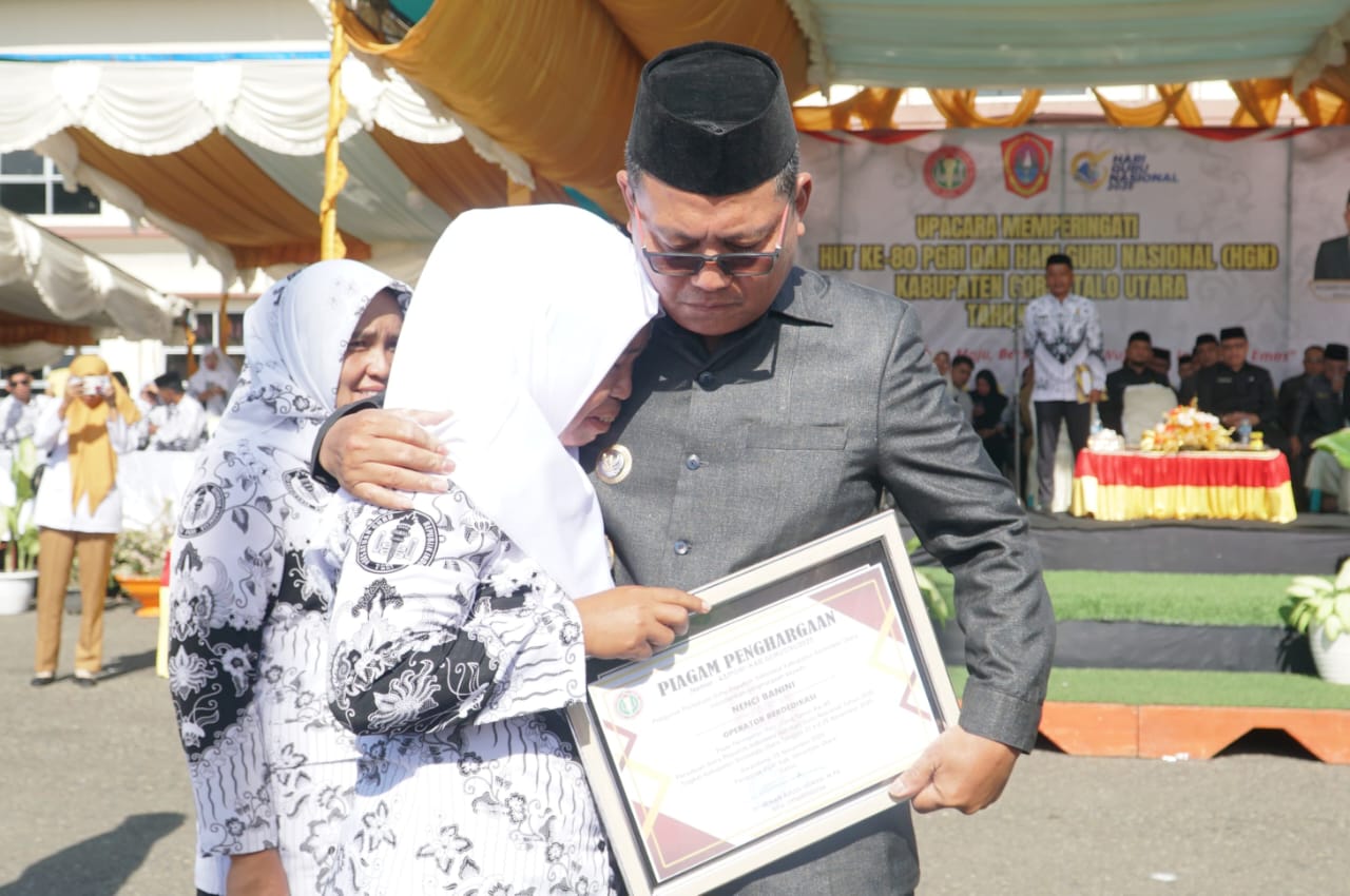 READ.ID – Bupati Gorontalo Utara Thariq Modanggu menunjukkan langkah yang jarang dilakukan pejabat publik ketika ia memutuskan menanggung honor operator SDN 7 Biau, Nenci Banini, menggunakan dana pribadinya. Keputusan itu disampaikan dalam kegiatan penyerahan penghargaan operator terbaik usai upacara memperingati Hari Guru Nasional, Selasa 25/11/2025.