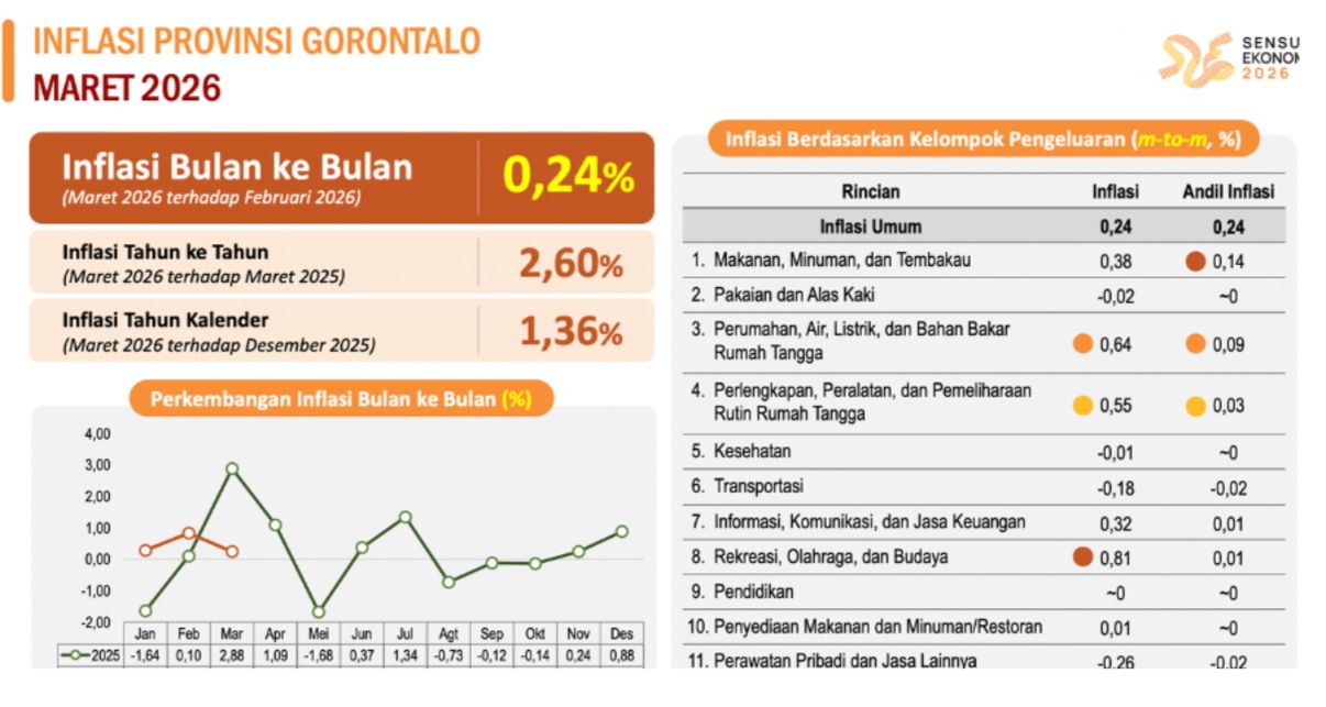 Hal ini sebagaimana rilis Badan Pusat Statistik (BPS) yang menyebut bahwa inflasi di Provinsi Gorontalo pada Maret 2026 terhadap Februari 2026 terkendali di angka 0,24 persen.