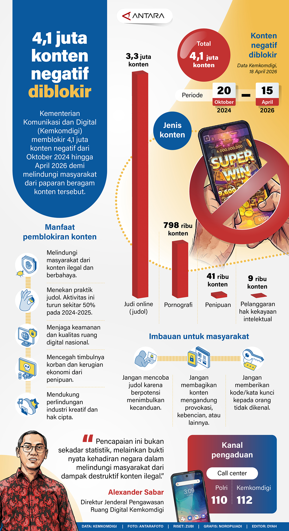 Home Menyapa Nusantara Komdigi Memblokir 4,1 juta Konten Negatif Menyapa Nusantara Komdigi Memblokir 4,1 juta Konten NegatifNadhira22/04/202624/04/2026 READ.ID – Kementerian Komunikasi dan Digital (Kemkomdigi) memblokir 4,1 juta konten negatif dari Oktober 2024 hingga April 2026 demi melindungi masyarakat dari paparan beragam konten tersebut.Baca berita kami lainnya di