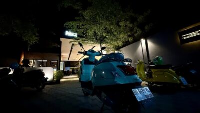 Malam hari membawa warna yang berbeda. Vespa warna-warni berjejer rapi di halaman, menciptakan nuansa vintage yang Instagrammable. Lampu-lampu kafe yang temaram memperlihatkan aktivitas di dalam: tawa, percakapan, dan para penikmat kopi yang enggan segera pulang.