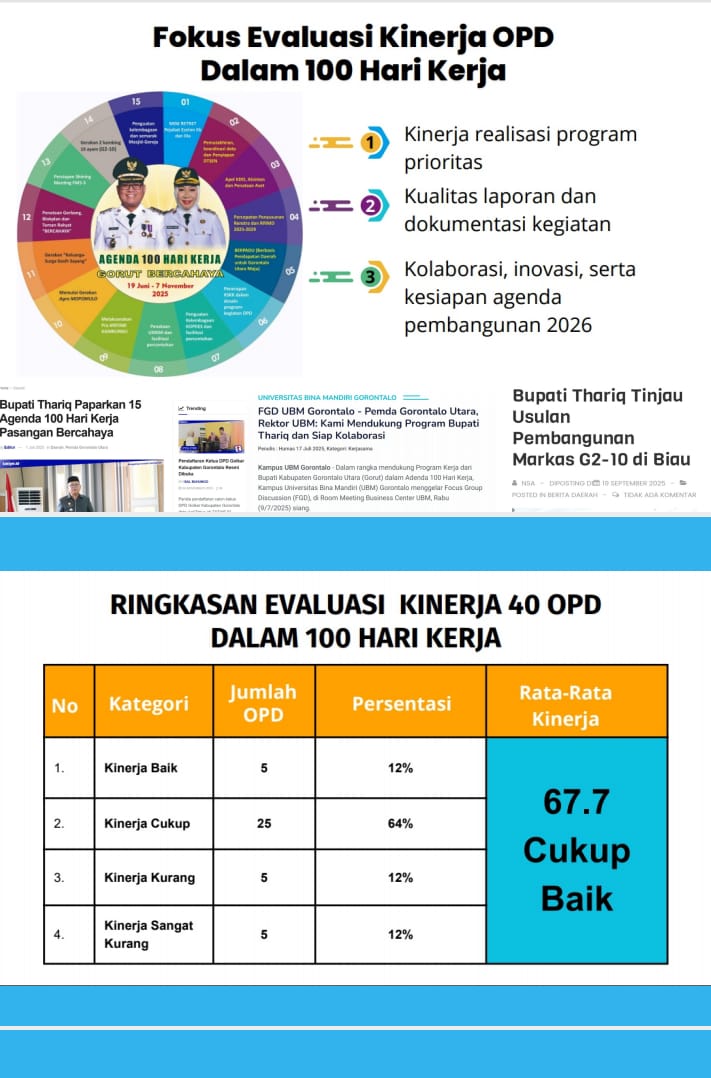 Pada kegiatan itu terungkap bahwa dari 15 agenda strategis 100 hari kerja, terdapat tiga poin utama yang menjadi fokus evaluasi Pemerintah Daerah, yakni realisasi kinerja program prioritas, kualitas laporan serta dokumentasi, dan kolaborasi inovasi serta kesiapan agenda pembangunan tahun 2026.