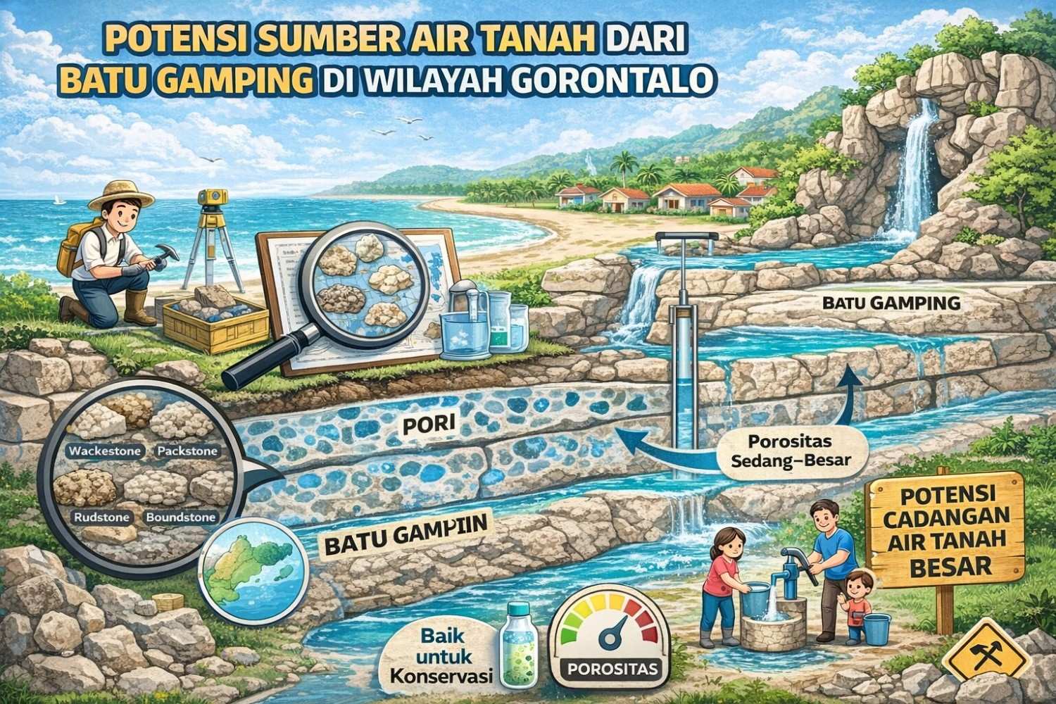 Tim peneliti dari Universitas Negeri Gorontalo mengungkap bahwa batu gamping (limestone) yang banyak ditemukan di kawasan pesisir Gorontalo memiliki potensi besar sebagai reservoir alami air tanah. Studi yang didanai oleh Kementerian Pendidikan, Kebudayaan, Riset, dan Teknologi Indonesia ini menyoroti satu kunci penting: porositas batuan.