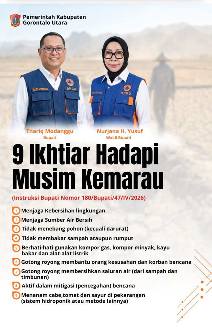 Bupati Gorontalo Utara, Thariq Modanggu, bersama Wakil Bupati Nurjana H. Yusuf, menegaskan bahwa seluruh elemen masyarakat, termasuk ASN dan pemerintah desa, harus meningkatkan kewaspadaan selama periode kemarau panjang.