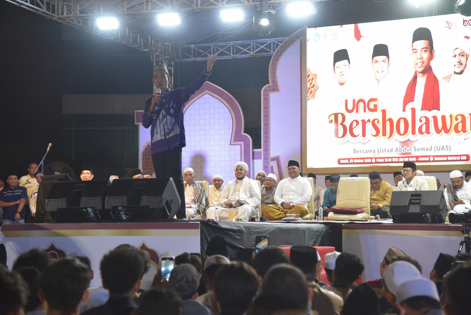 READ.ID – Ribuan jemaah memadati Lapangan Rektorat UNG, dalam pelaksanaan UNG Bersholawat yang menghadirkan ulama kondang, Ustaz Abdul Somad (UAS), Kamis (23/10). Lantunan dzikir dan sholawat menggema dari ribuan jemaah, yang menciptakan suasana religius dan penuh kekhusyukan di lingkungan kampus.